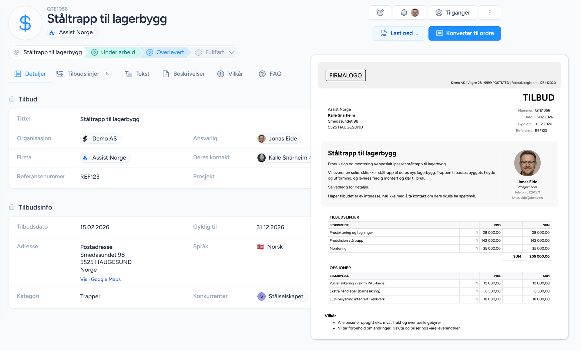 Bygg enkelt tilbud med produkter, standardtekster og faste strukturer. Generer ferdig PDF på sekunder. Profesjonelt, effektivt og uten dobbeltarbeid.