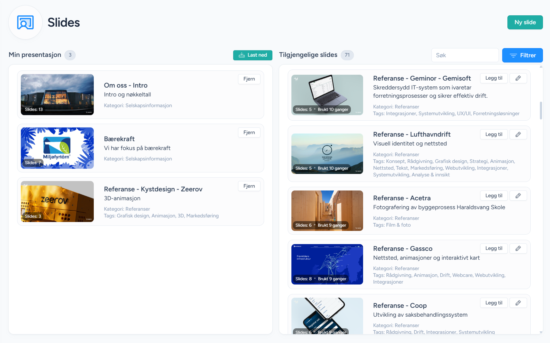 Sett sammen salgspresentasjoner med dra-og-slipp fra deres eget slides-arkiv. Referanser, produkter og info – klart på få minutter. Alltid oppdatert.